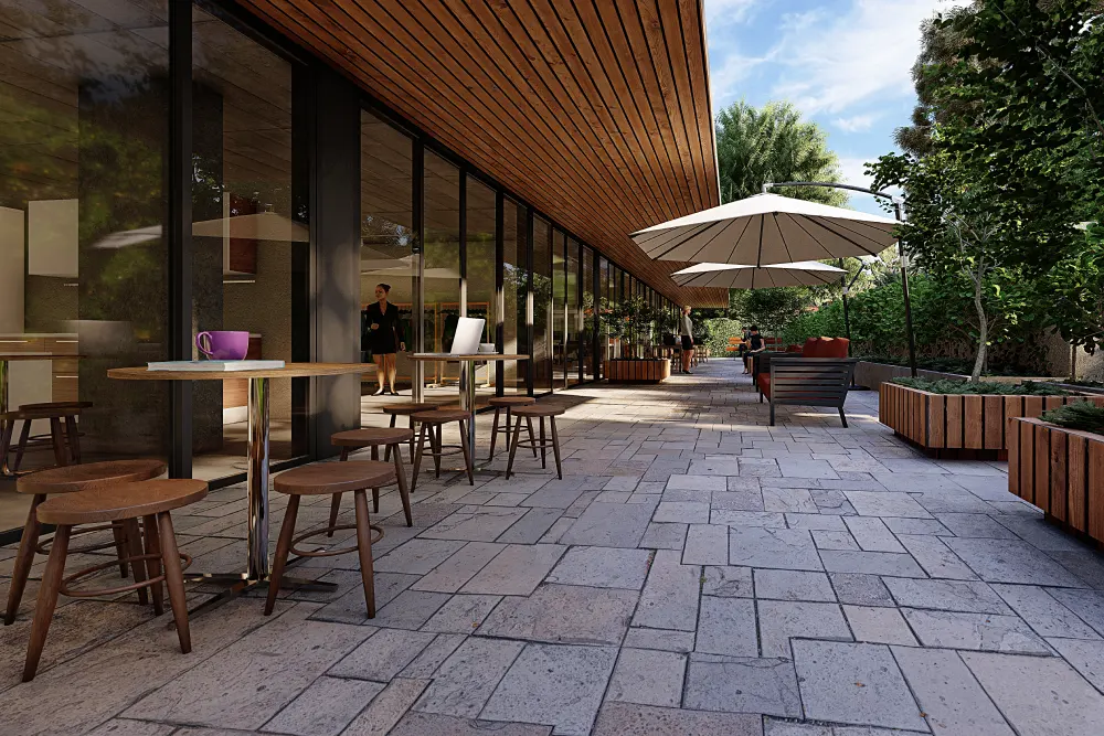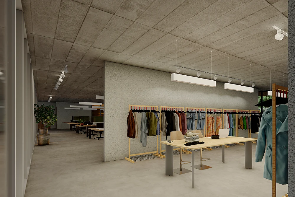 Materiais como concreto aparente, madeira natural e esquadrias metálicas pretas conferem identidade contemporânea e equilíbrio entre o industrial e o artesanal — traduzindo a essência do fazer criativo da moda. Os espaços internos se organizam em setores bem definidos: áreas de corte e costura, salas de criação, coworking, showroom, administração e um café integrado à área externa, concebida como extensão do ambiente de trabalho.