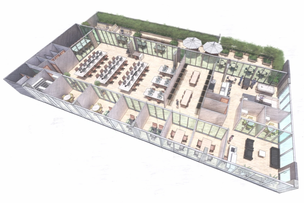 A proposta parte da integração entre ambientes de trabalho, convivência e experimentação, conectando o processo criativo ao cotidiano dos profissionais do ateliê. O layout privilegia a transparência e a fluidez espacial, com amplos panos de vidro que promovem a entrada de luz natural e abrem o espaço para o entorno verde.