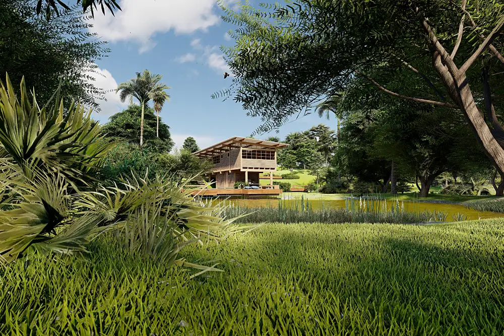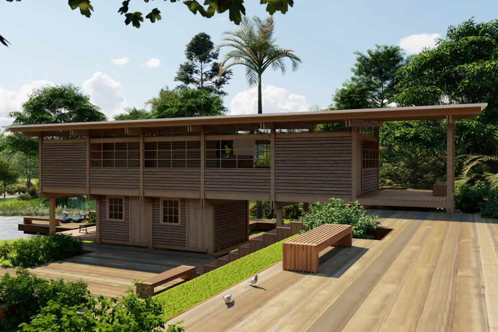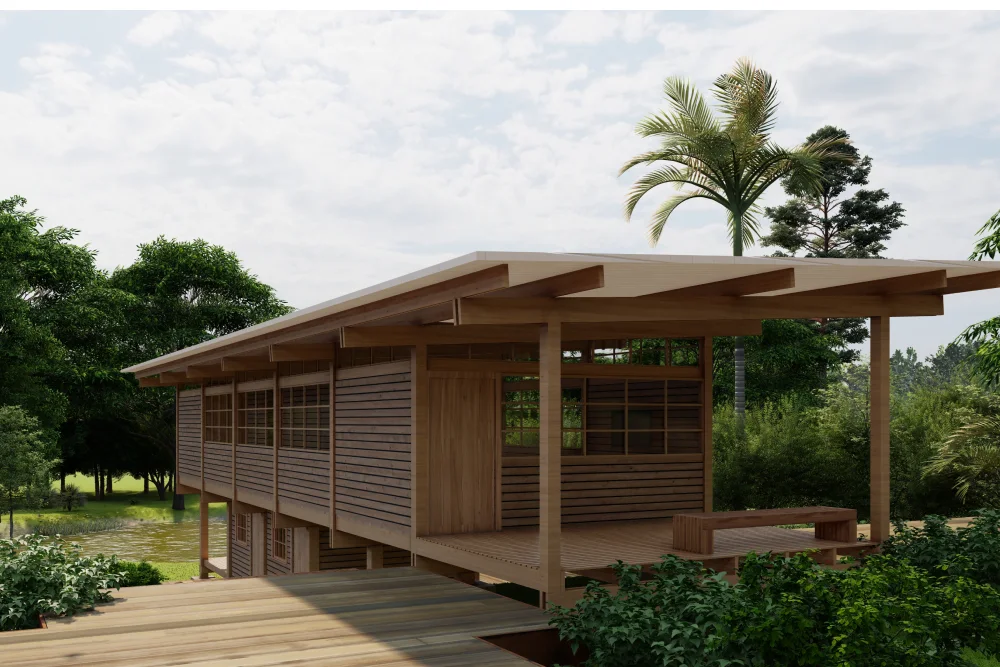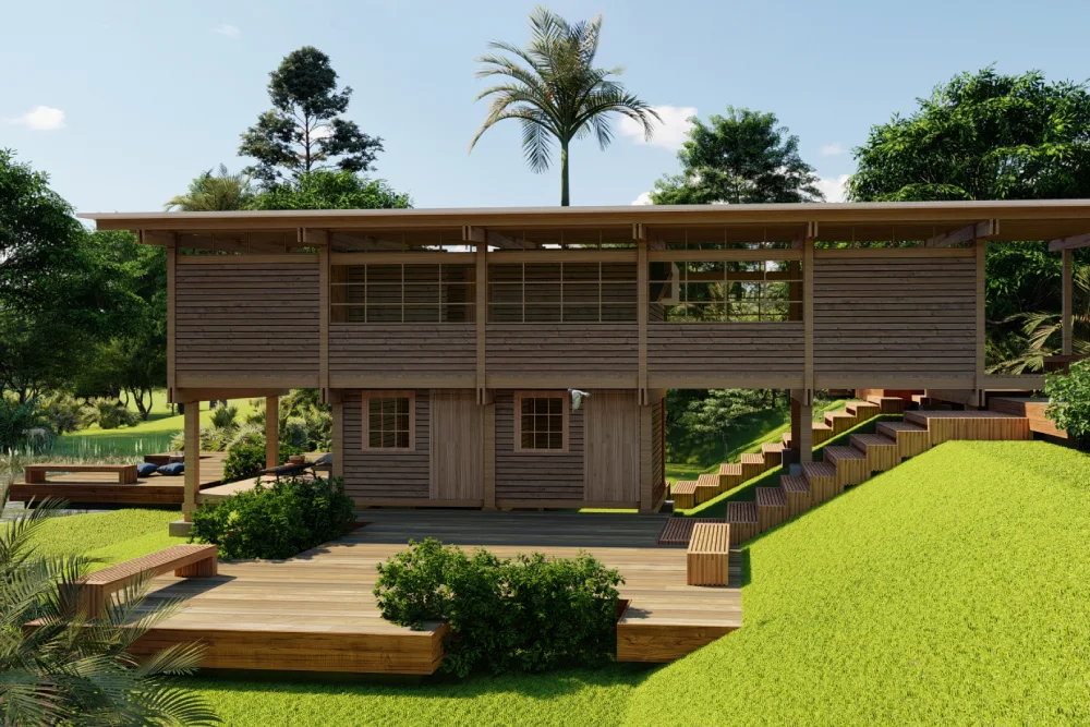 O uso da MLC — material de alta resistência e precisão industrial — garante estabilidade estrutural, durabilidade e estética refinada, evidenciando a textura natural da madeira. Assim, o projeto articula tecnologia e organicidade, unindo tradição construtiva e inovação contemporânea em uma obra que valoriza o ambiente e o modo de viver integrado à paisagem.